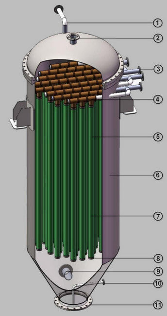 Фильтровальная корка образуется на внешней поверхности каждого свечного фильтрующего элемента из нержавеющей стали. В соответствии с требованиями к конструкции фильтрующие свечи в каждом ряду соединены сверху последовательно и параллельно. Этот дизайн определяется в соответствии с результатом требования процесса.